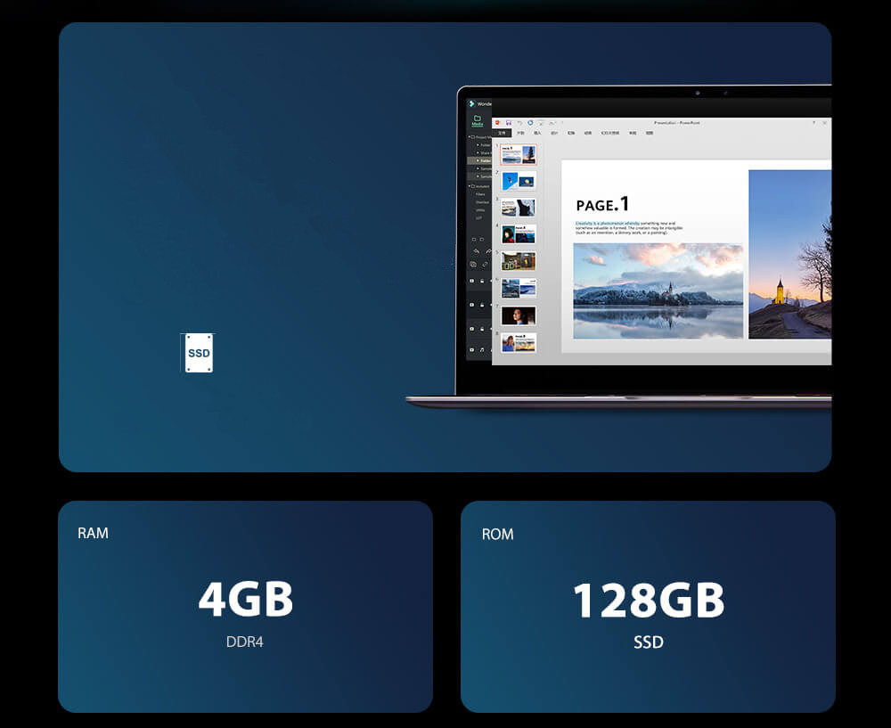 В ноутбуке AceBook1 установлено 4Гб DDR4 памяти, SSD накопитель ёмкостью 128Гб, а также можно добавить карту памяти до 256Гб. Вы всегда можете взять с собой нужный архив фото или видео.