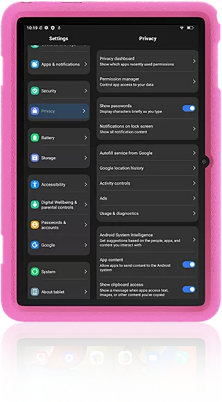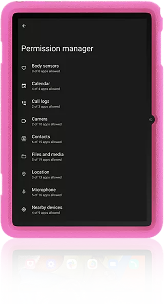 Owing to Android 12, Tab 8 Kids steps up privacy protection for users. The Permission manager delivers better control over app access to your data while Privacy dashboard clearly inform you of which apps recently used permission so that you have much less risk of personal data leak.